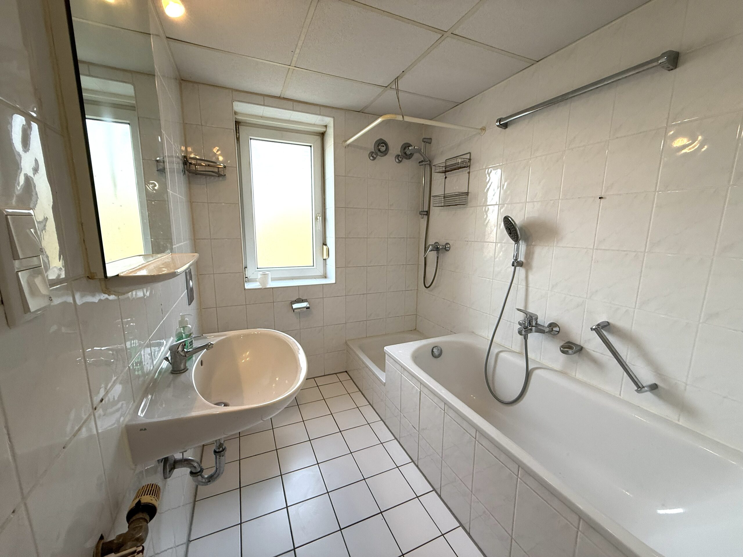 Das Badezimmer ist mit Dusche und Badewanne ausgestattet und hell gefliest. Ein Fenster sorgt für Helligkeit und gute Belüftung.